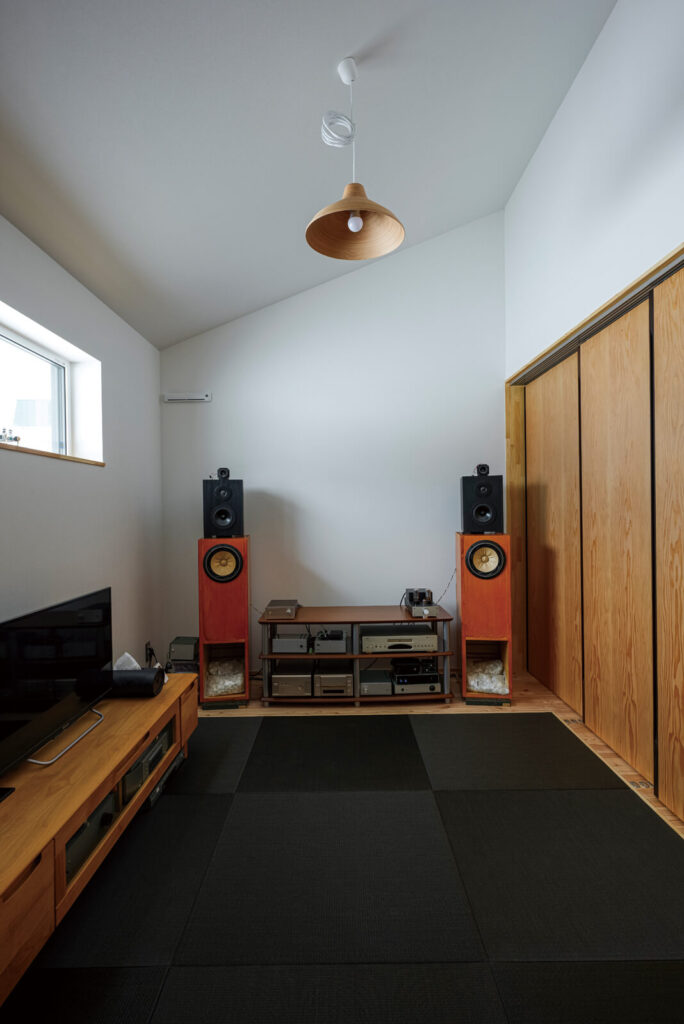 「オーディオシステムはフローリングの上に置きたいが、畳のスペースもほしい」というTさんの希望に応えた一室。昼間はLDKの一部として、夜は建具で仕切って寝室として使っている