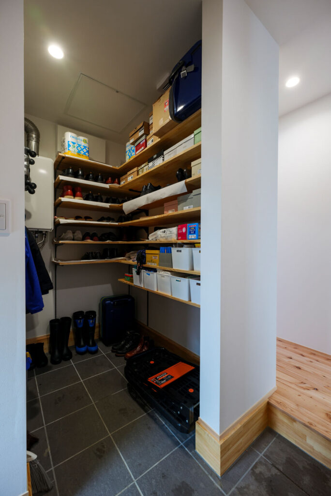 コートかけを組み込んだオープンなシューズクローク。室温がどこも一定のため、雪で濡れた長靴や傘も次の日には乾いているそう。適材適所の収納計画が、暮らしやすさを助ける