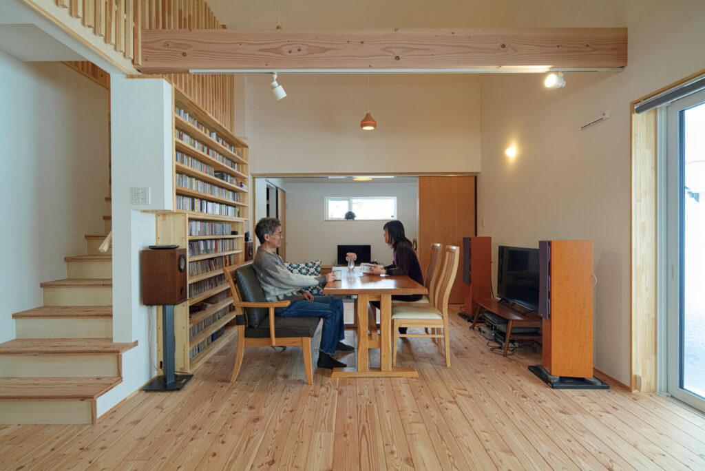 構造材はアカマツ材、LDKの床や階段は北海道産のカラマツ材で仕上げた。ダイニングのCDラックは造作で、約1,700枚のコレクションが収納可能