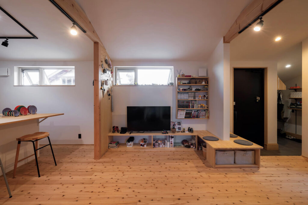 リビングから壁沿いに続くテレビ台は、徐々に役割をベンチに変えていく予定。35㎝高で座りやすく、買い物帰りのときは荷物を置きやすい高さ
