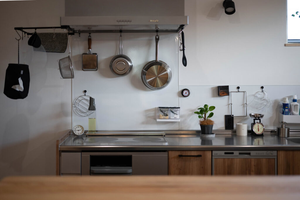キッチンにも見せる収納を取り入れた。隠す収納よりも省スペースで済むというメリットがある