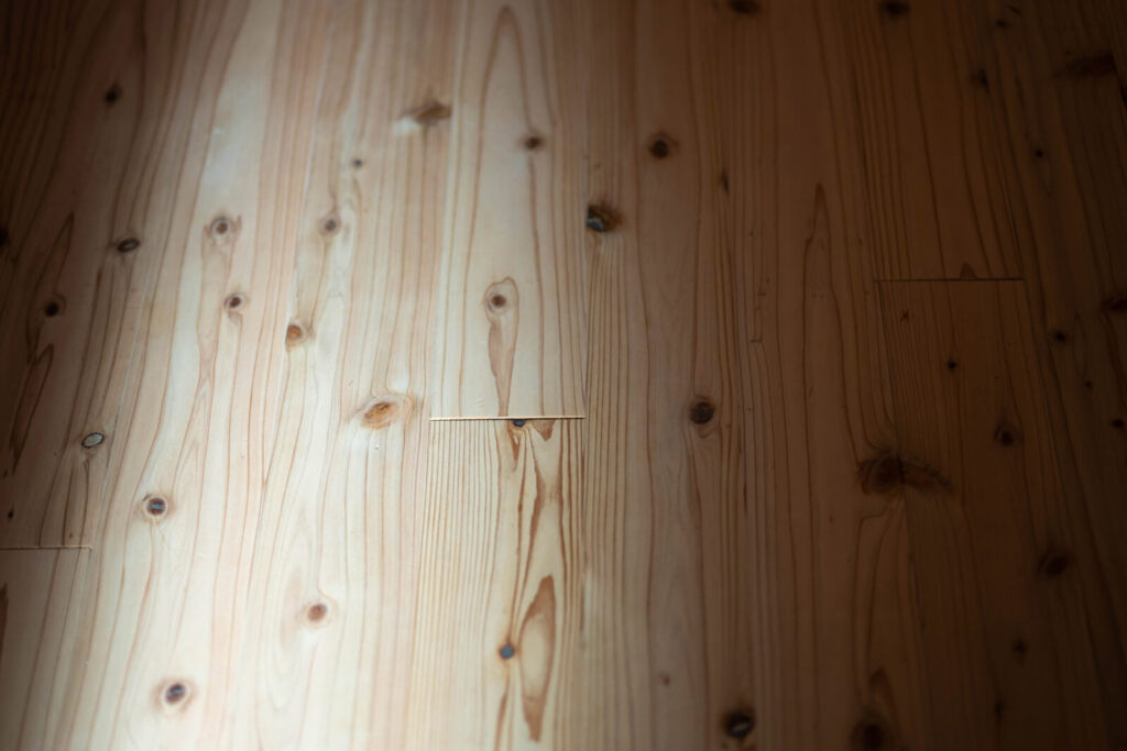 LDKの床は木目が滑らかに浮き上がる浮造り加工のスギ材。建具もすべてスギ材の挽板で造作した