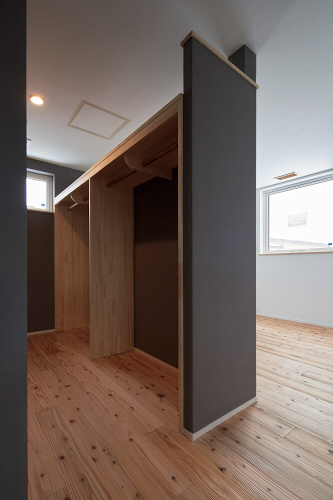 夫婦の寝室には大型のウォークインクローゼットを設けた。上部の隙間と扉のない構造と塗り壁で、常に調湿されているので湿気がこもる心配がない