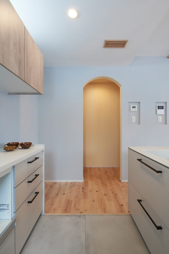 キッチン横にあるパントリーのアールの入り口がかわいらしい