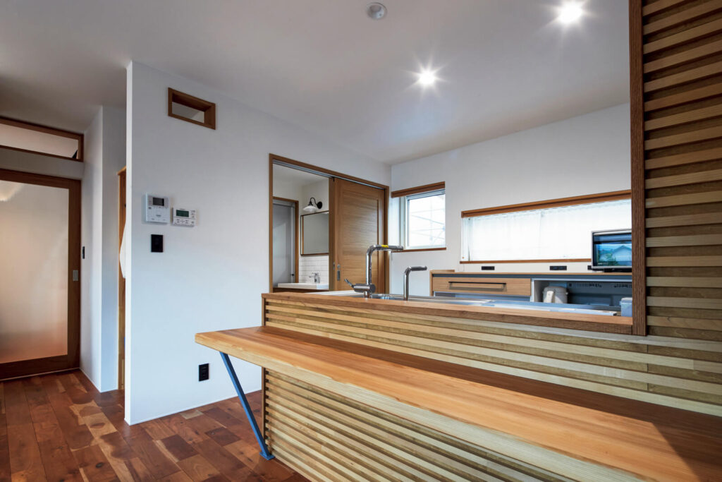 1階のキッチンカウンターには、スギの1枚板が使われている
