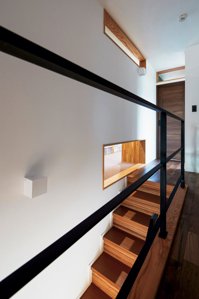 一方、2階はHさんご家族がゆったり暮らせる広さを確保。15帖ものLDKには大きな窓を設け、開放感を演出しています。居室以外にも階段や洗面台など、木の質感と、機能とデザインを考えた造作が随所に見られ、家族の快適な暮らしへの心配りが感じられます。また、部屋と部屋の間、部屋と廊下の間などのあちこちに通気口が開けられているのは、空気を通し屋内の温度を一定にするためです。