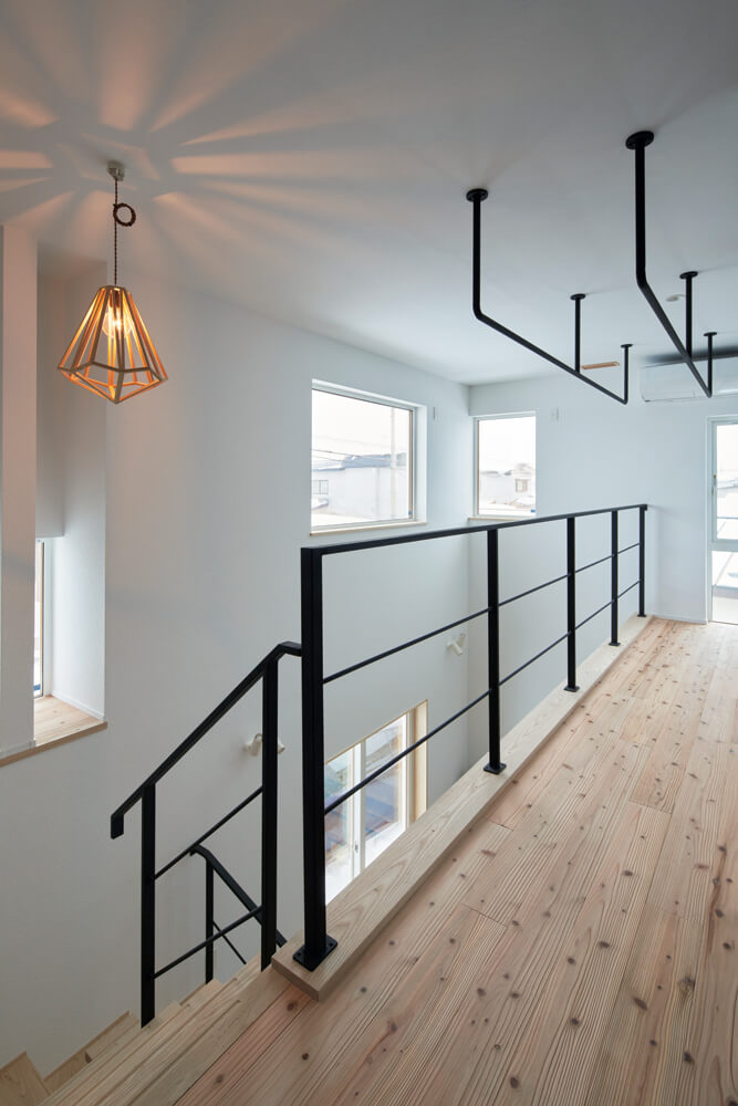 開放感の演出や採光だけでなく、空気の対流を生み、家全体の温度を均一にする役割も果たす吹き抜け。黒のアイアン手すりがアクセントに