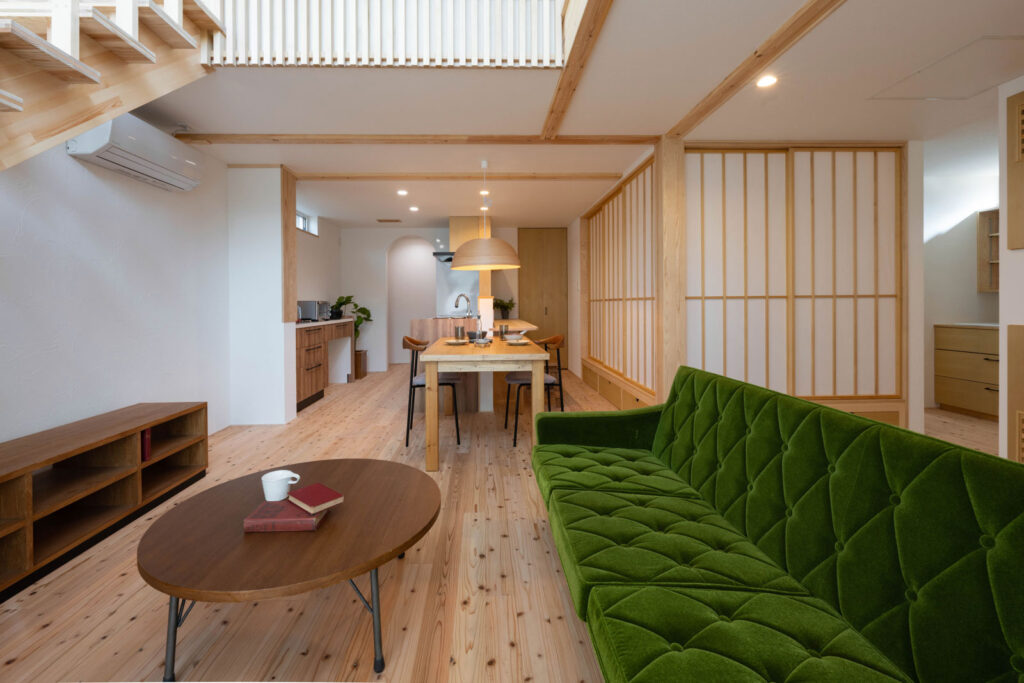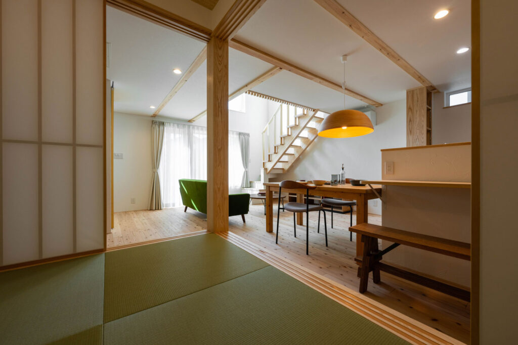 リビングに隣接する畳コーナーは、小上がり仕様でベンチ代わりに。障子を閉めると独立した部屋として使える