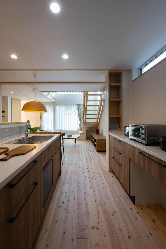 塗り壁や浮造り仕上げのスギ無垢床、木製階段、随所に設えた造作など、室内は自然素材がもたらす気持ちよさに満ちている